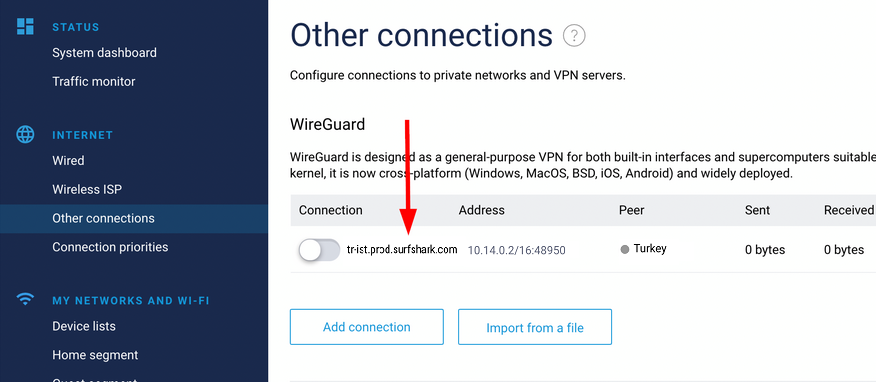 Once rebooted, open up the router interface again and select the Other connections menu. Click the Import from a file button (refer to Choose a Surfshark server section in this article).