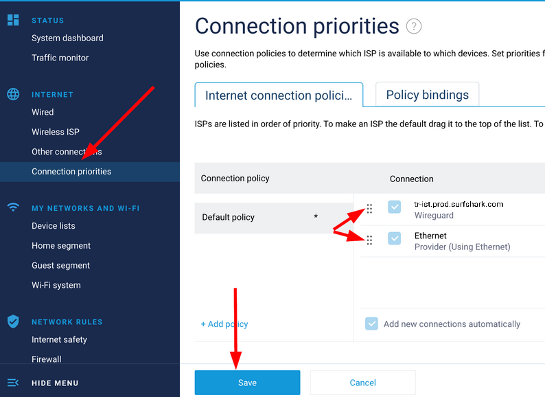 Open the Connection priorities menu, move the added VPN connection to the top so that it is the first, and click Save.