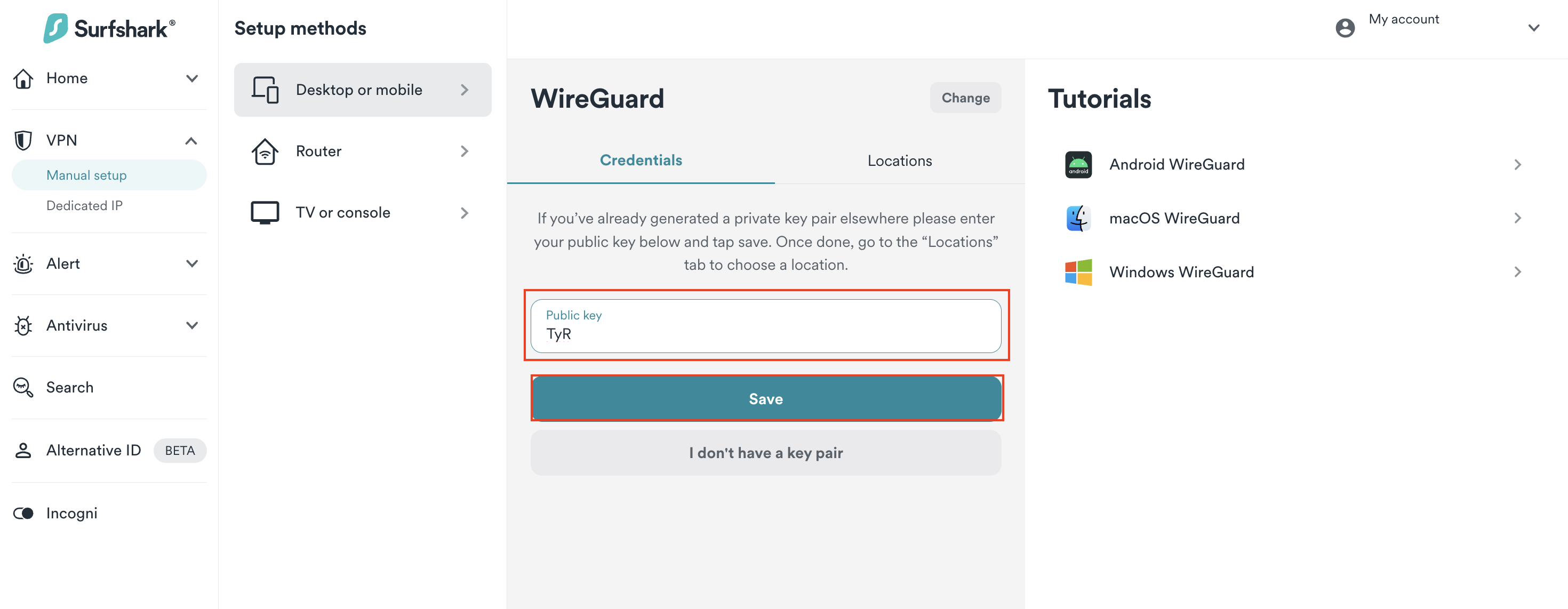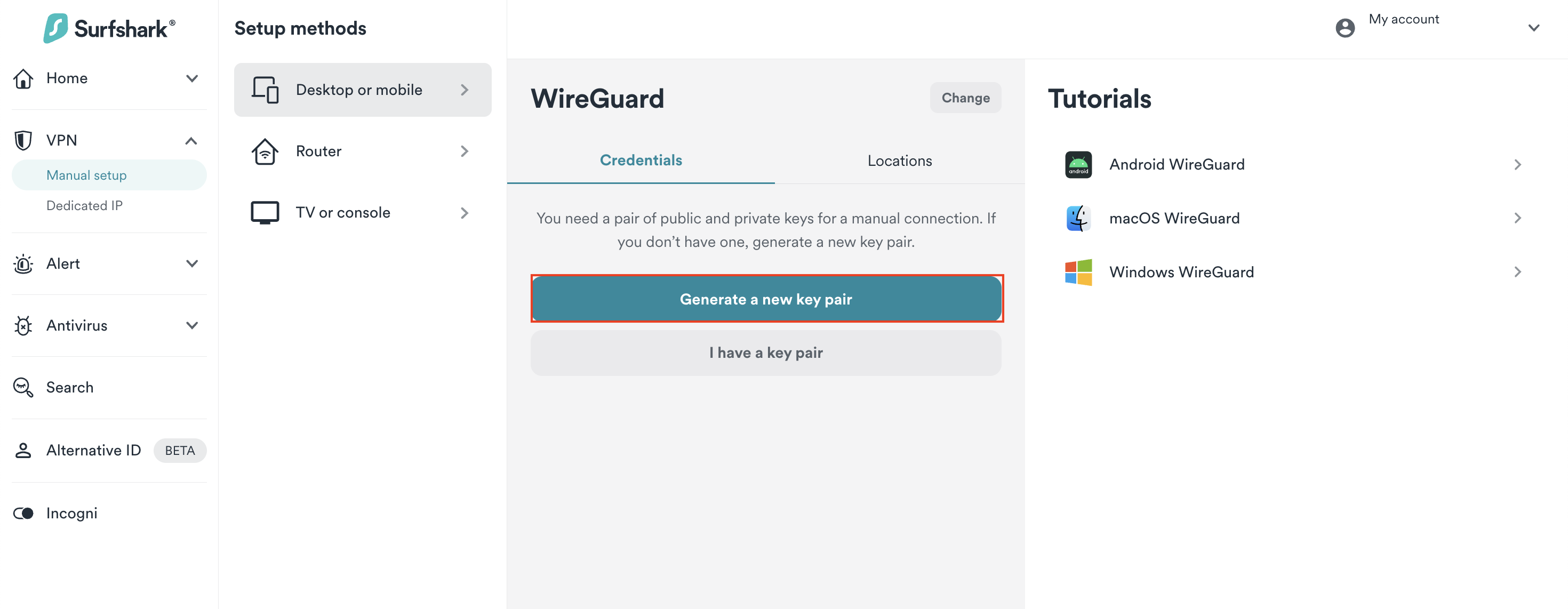 1. Go to Surfshark's login page and log in. Then, visit VPN > Manual setup. Choose the Desktop or mobile option and click on WireGuard.