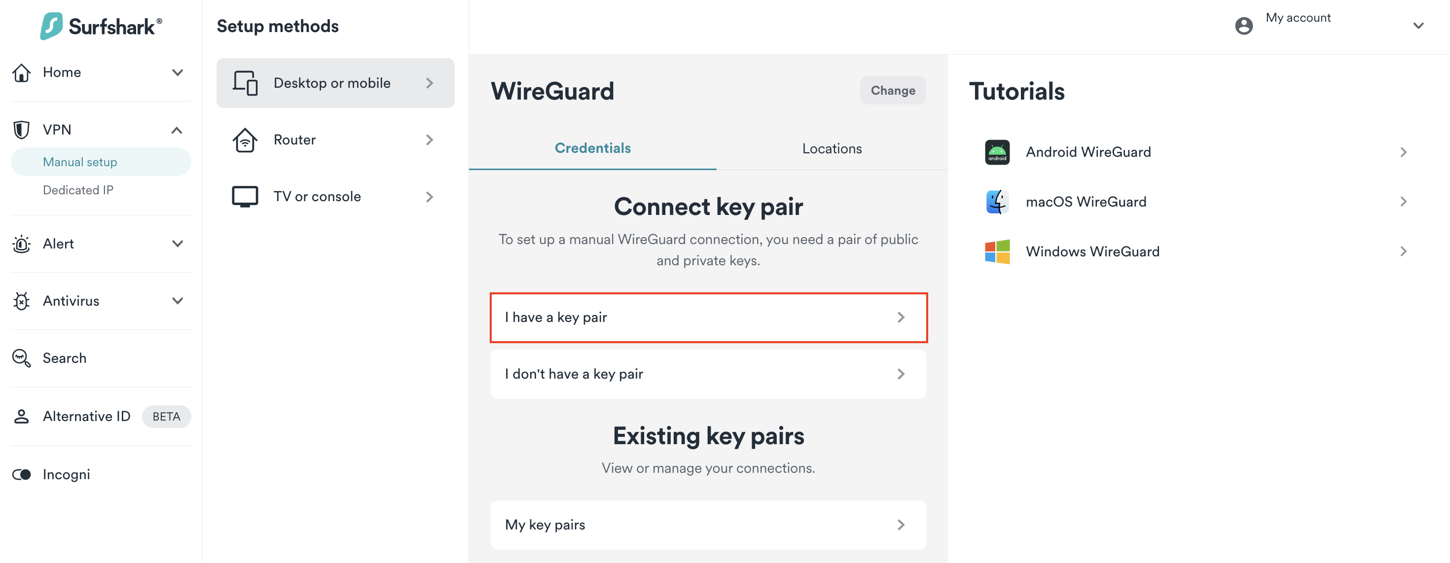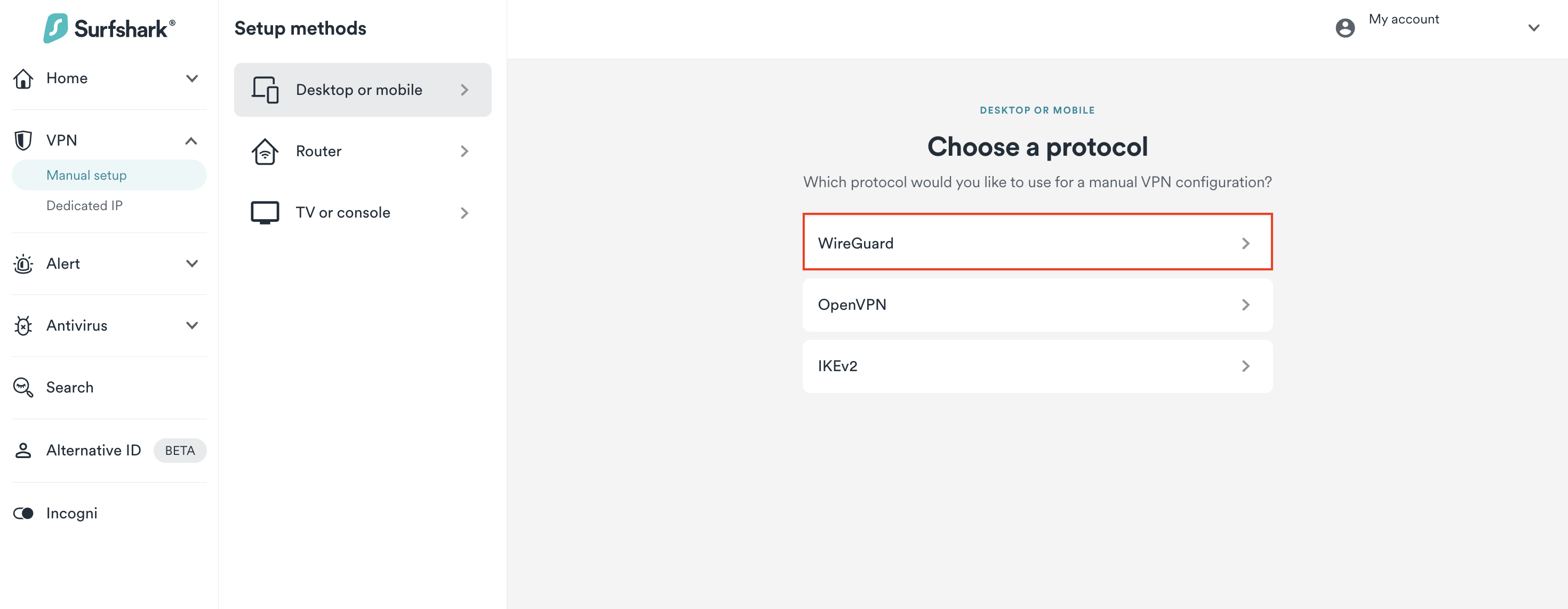 1. Go to Surfshark's login page and log in. Then, visit VPN > Manual setup. Choose the Desktop or mobile option and click on WireGuard.