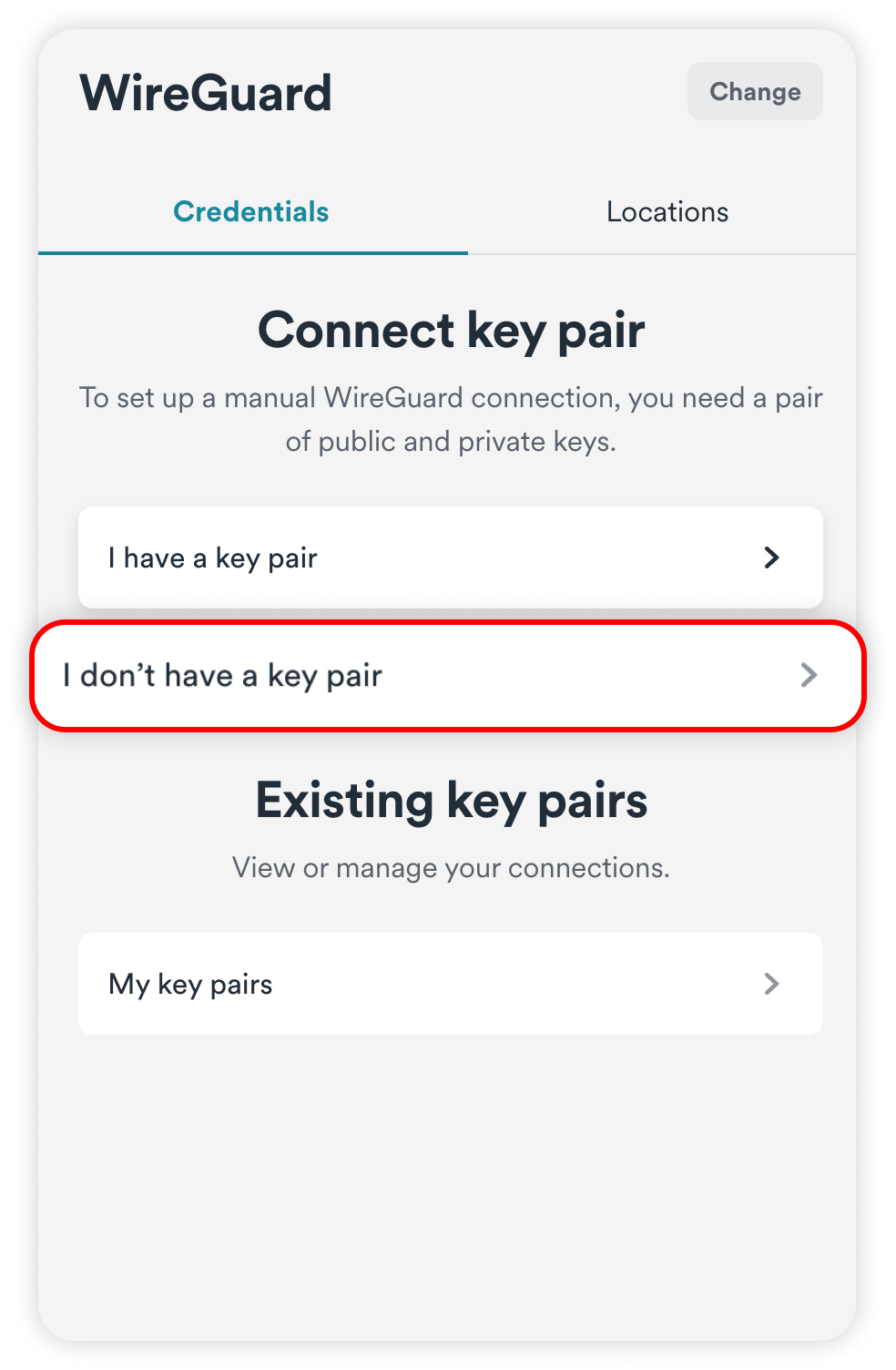 NOTE: If you have already created a key pair, simply press I have a key pair, and enter your public key.