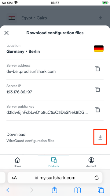 1. Open Safari or any browser on your iOS device, and go to Surfshark's login page. Tap Products > VPN > Manual setup > Desktop or mobile > WireGuard